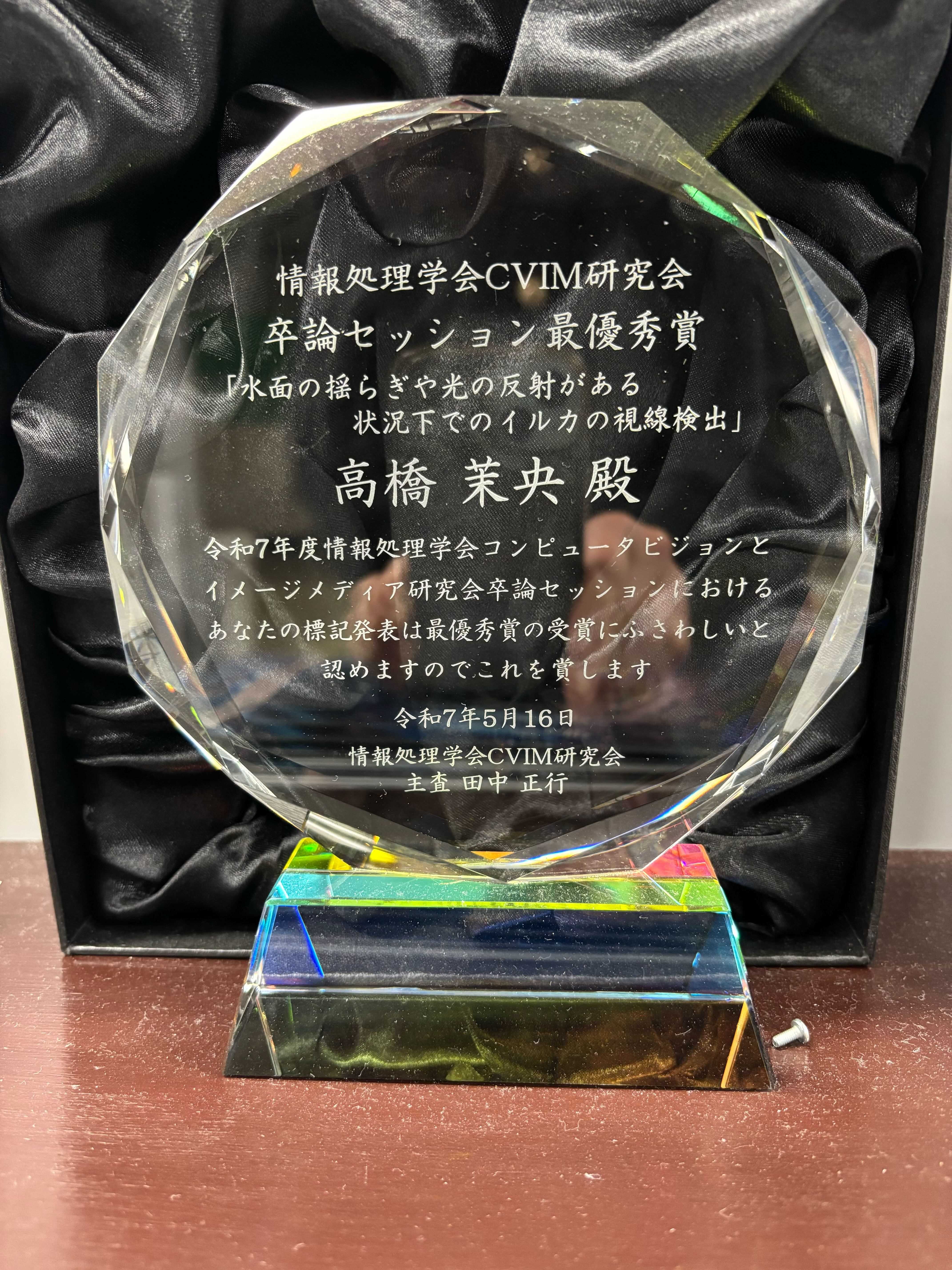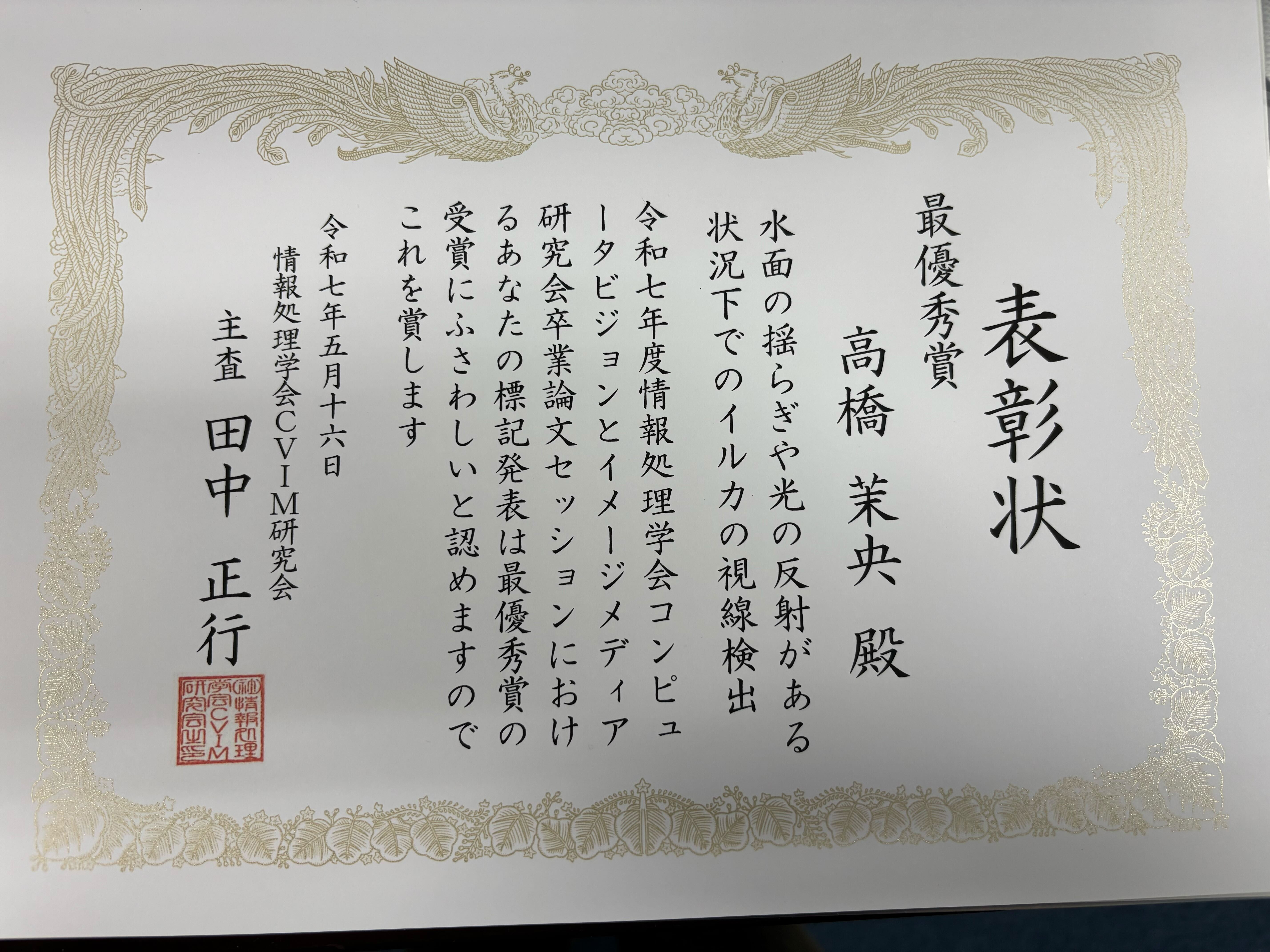 2025.5.16 高橋さん(M1)がCVIM研究会・PRMU研究会卒論セッション最優秀賞を受賞しました.